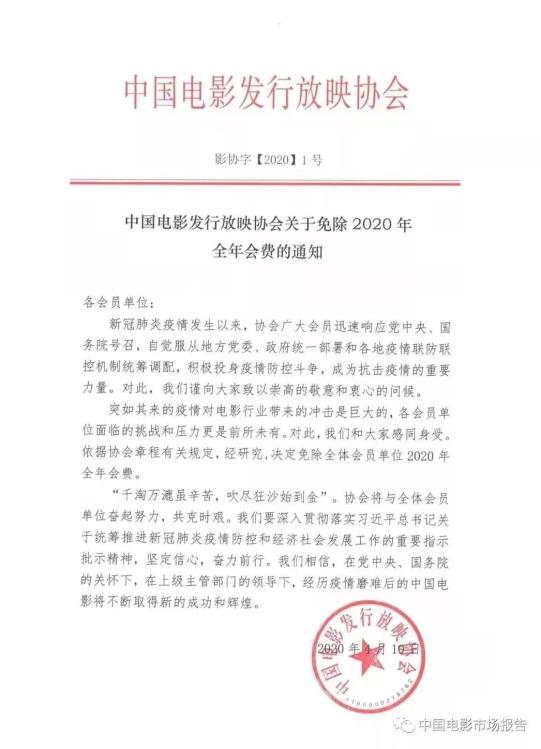 4月10日,中国电影发行放映协会关于免除2020年全年会费的通知,免除全体会员单位2020年全年会费。