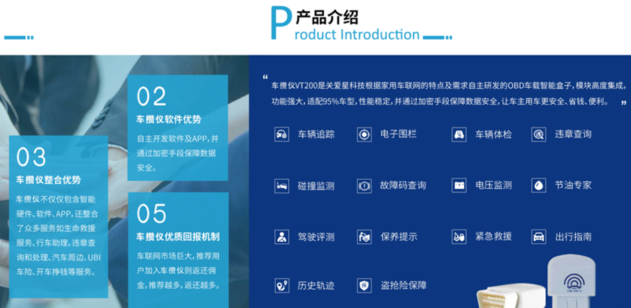 对于购车后的汽车养护服务,攒车帮针对汽车和人员安全保障推出了一个保养套餐,将公司自主品牌销售的央视合作产品金金润滑油作为换油服务的主打产品,减少了市场质量参差不齐的汽油对发动机的磨损,增加了车辆运行的安全;同时根据车联网的特点和需求联合关爱科技设计研发OBD车载智能盒子车攒仪,为车主提供汽车行程、汽车故障、汽车定位、汽车防盗等服务,实现车辆信息的共享;同时还与广东翼卡联合,推出行车SOS服务,为车主行车安全提供24小时的故事处理服务,包含可视化生命救援、道路救援、私人医生、疲劳陪驾等服务,6秒内给出车辆定位并将信息即时反馈给平台客服,24小时在线的人工客服第一时间将信息反馈给相关交通部门进行处理,为汽车门店、交通、保险提供精准的车辆信息大数据。目前车攒仪可以使用于95%的车型,性能稳定,并通过加密手段保证数据的安全,让车主更加安全、省钱和便利,这一模式同样也适用于对车队司机的统一管理。