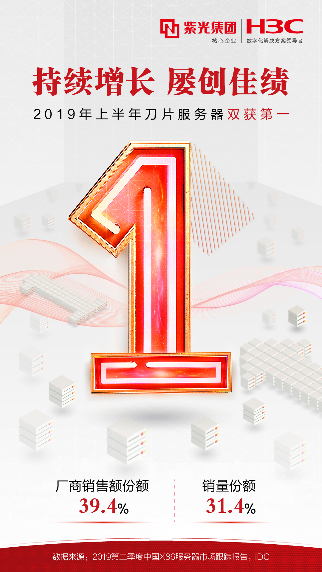 近日,全球权威市场研究机构IDC公布了2019年第二季度中国x86服务器市场跟踪报告,紫光旗下新华三集团服务器业务再创佳绩,其中刀片服务器深得市场青睐,取得2019年第二季度与上半年销售量和销售额双项第一的优异成绩,上半年刀片服务器销售量占比31.4%、厂商销售额占比39.4%,销售额更是超过市场排名第二、三名厂商的总和。