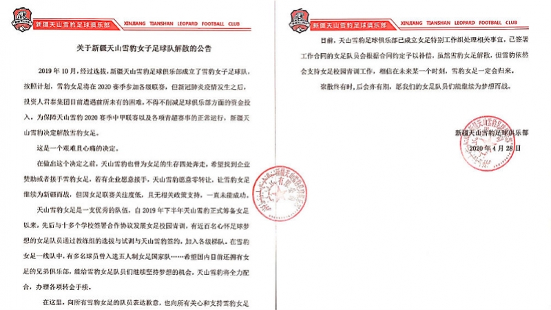 北京时间4月28日傍晚,中甲新疆天山雪豹足球俱乐部官方宣布,为保障天山雪豹2020赛季中甲联赛以及各项青超赛事的正常运行,新疆天山雪豹决定解散雪豹女足。