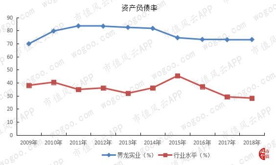 从这十年间的资产负债率来看,界龙实业的债务负担远远高于行业一般水平。界龙实业的资产负债率基本保持在70%以上,而印刷业同行的资产负债率基本在40%以下,近几年还呈不断下降的趋势,特别是2018年,资产负债率下降到了28.28%。