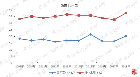 毛利考察的是一个企业在生产过程中的直接获利能力。界龙实业的销售毛利率一直远低于行业水平。这十年来,界龙实业的销售毛利率鲜有超过20%的,而整个行业的销售毛利率基本维持在30%以上。