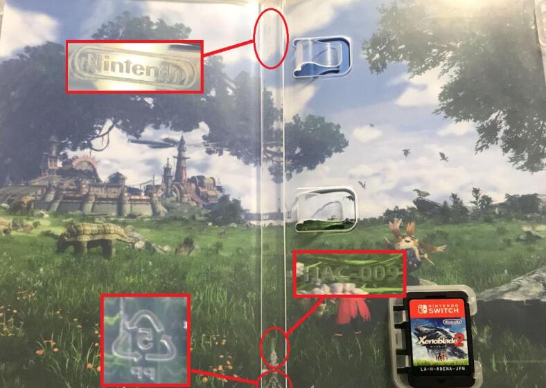 2017年底,《异度神剑2》上市。因为出货量小、玩家口碑高,加上只有日版和港版才包含中文,它的卡带在国内一时洛阳纸贵,可说是NS上的第一代“理财产品”。但很快,有些玩家发现自己买到的游戏包装不太对劲。这里我们以一个2017年首发日版《异度神剑2》的包装盒为例,先看看原装正版的盒子细节是怎么样的。当我们打开一个NS卡带盒,可以在正中的盒脊上半部分找到浮雕印刷的“Nintendo”标志;而在底部靠上则可以看到同样浮雕印刷的“HAC-009”字样。