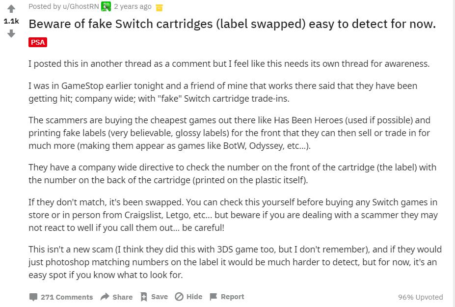 根据帖子描述,有作案团伙在收购一些市价便宜的冷门NS卡带后,不仅是制作假盒,还把贴在卡带上的标签也替换掉,彻底伪装成其他热门高价的游戏,再拿去游戏零售店利用检查不严的漏洞出二手或者以旧换新。所以消费者在租借或购买二手卡时还得注意核对刻在卡带背面的商品码,以免中招。