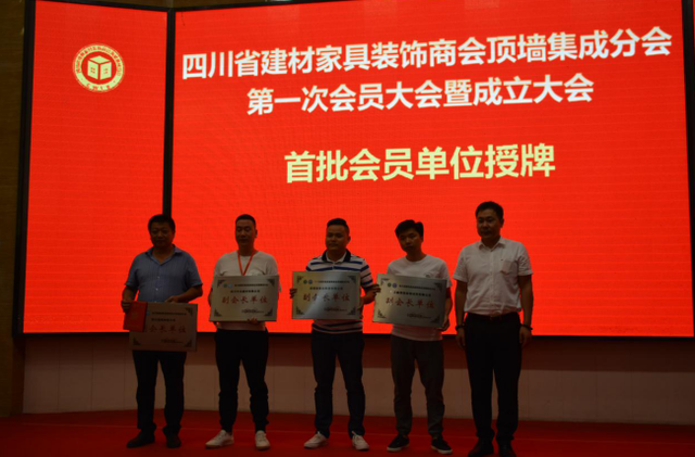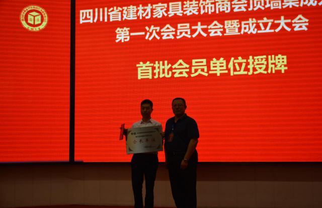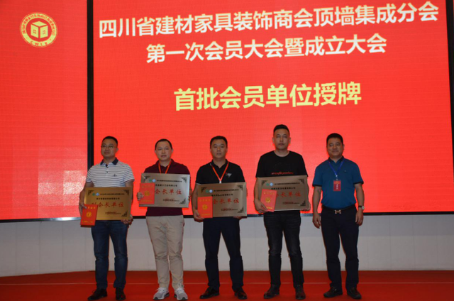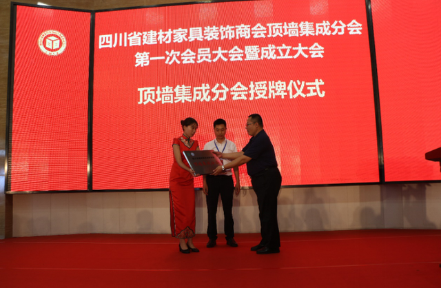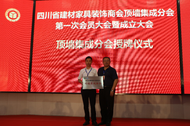 在主持人的宣布下,四川润邦建材有限公司董事长张先文先生上台从四川省建材家居装饰商会会长杨文松先生手中接受顶墙集成分会牌匾,完成授牌仪式。