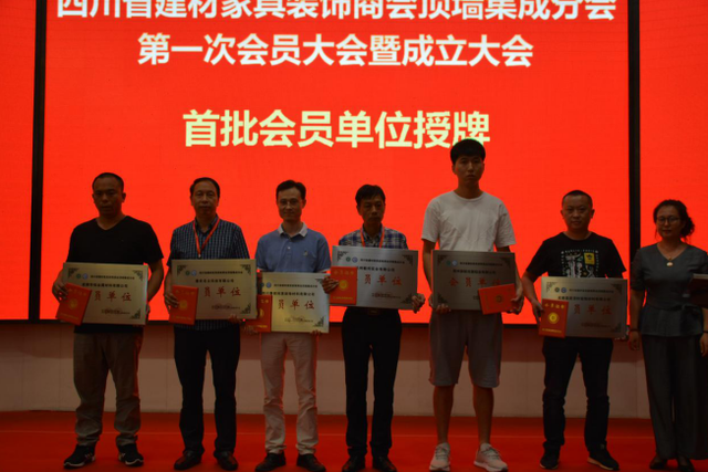 四川省建材家具装饰商会顶墙集成分会秘书长张喜凤女士为会员单位成都华铄金属材料有限公司、四川鲁班创美装饰材料有限公司、郑州荥阳龙基铝业有限公司、成都茂杉建筑材料有限公司、重庆名立科技有限公司、杭州敏邦实业有限公司、成都易居顶材装饰材料有限公司授牌为会员单位颁发铜牌和证书。