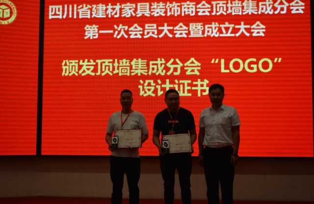丁辉秘书长为重庆品联工艺品有限公司、四川中沃建材有限公司设计师颁发顶墙集成分会logo设计荣誉证书。
