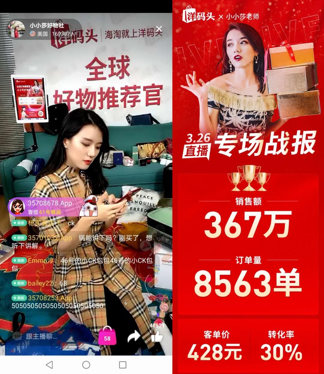 之前,粉丝爱看小小莎用旅游视频带他们周游世界,现在,小小莎通过担任洋码头全球好物推荐官,把全世界好物介绍给粉丝,用另一种方式带他们周游世界。双方用户群和品牌形象的高度契合,让直播转化率高达30%,单场卖爆367万。小小莎也因此成功转型带货主播,打开了全新的事业版图。