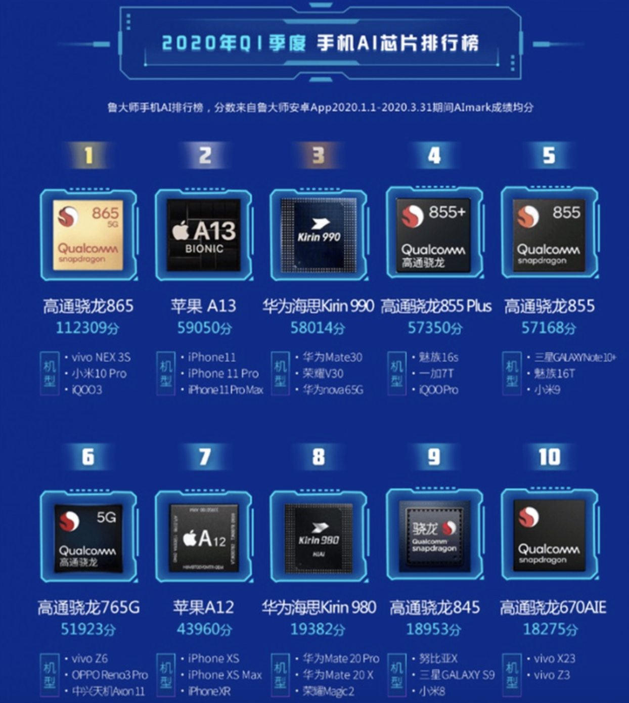近日,鲁大师公布了2020年第一季度的手机AI芯片排行榜,其中高通骁龙865以112309的得分排名第一,苹果A13排名第二,得分为59050;华为麒麟990排名第三,得分为58014。同时,排名前十的AI芯片中,有六款来自高通的骁龙移动平台,除了骁龙865之外,还有骁龙855/855+、骁龙765G、骁龙845和骁龙670AIE。