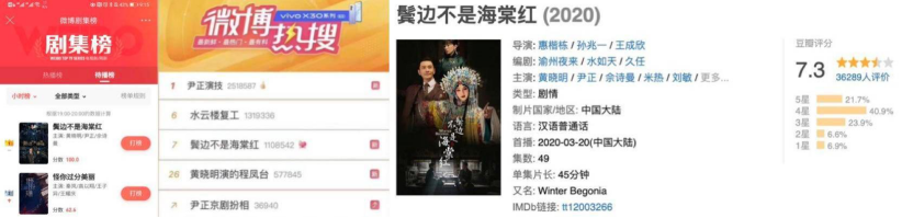 由爱奇艺出品,欢娱影视、句墨影视联合出品,戴莹、于正任总制片人,惠楷栋执导,黄晓明、尹正、佘诗曼领衔主演的民国传奇情感大剧《鬓边不是海棠红》于3月20日正式上线,上线次日便在爱奇艺站内热度突破7000,截止3月27日,微博官方话题#电视剧鬓边不是海棠红#阅读量8.3亿且仍在攀升,“尹正演技”、“水云楼复工”等话题冲进微博热搜前十位。相关内容分别登上知乎热榜、百度热榜,猫眼全网热播榜TOP1,并获得豆瓣7.3的高口碑评分,引爆社交关注讨论热潮。