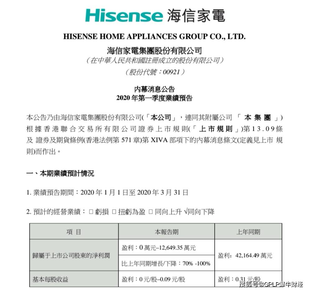 4月14日,海信家电(公布的业绩预告显示,预计2020年第一季度归属于上市公司股东的净利润为0万元至12649.35万元,同比下降70%-100%。