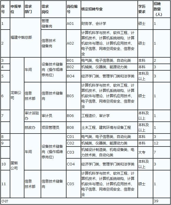 (一)全日制2020年应届毕业生,学历和专业符合要求;其中福建中烟总部管理储备岗(A01)和信息技术储备岗(A02)可以放宽至2018年(含)以后毕业的毕业生;