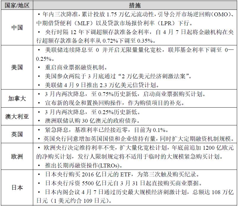 各国央行为了保经济、保就业、保资本市场,正在积极应对。截至4月初(如表1),全球已有多个国家和地区通过货币政策和财政政策刺激新冠疫情冲击下的经济。此次疫情最终传播范围有多大、发展到何种地步仍是未知数。因此,公共卫生、经济增长以及金融和不动产市场受到最终影响,仍存在巨大不确定性。