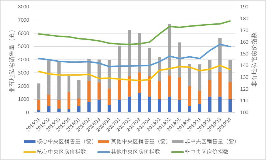 重点来看非有地私宅租售市场。销售市场:2019年3月1日起,新加坡非有地私宅用地发展费平均调低5.5%,扭转之前连续5次发展费上调,引发第二季度的楼市回暖。至2019年第四季度,全国销售量环比缩减30%,同比增长7%;价格指数环比微跌0.7%,同比增长2.4%(图17)。和上一季度对比,非有地私宅销售市场逐渐冷静,但总体市场情绪好于去年同期。全年来看,非有地私宅价格同比上涨1.5%,低于2018年8.3%的同比涨幅。外部经济环境的不确定性和降温措施的实施,导致价格增长放缓。