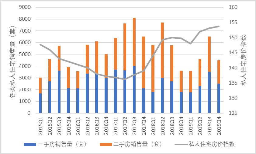此报告主要关注私人住宅租售市场。2018年7月,新加坡出台新一轮降温措施,对买家加征了繁重的印花税,导致开发商和投资者对前景预估比较保守,私人住宅市场观望情绪相对浓厚,一二手住房销售量均开始下滑。至2019年中,各季度成交量普遍低于往年同期,带动房价从2018年中的高点开始下跌(图16)。2019年下半年,新加坡市场成为香港修例风波出逃资金的避险地,叠加前一年的政策影响逐渐被消化,私人住宅交易量价齐升。据新加坡市区重建局(URA)数据,2019年第四季度,私人住宅价格同比上涨2.5%。