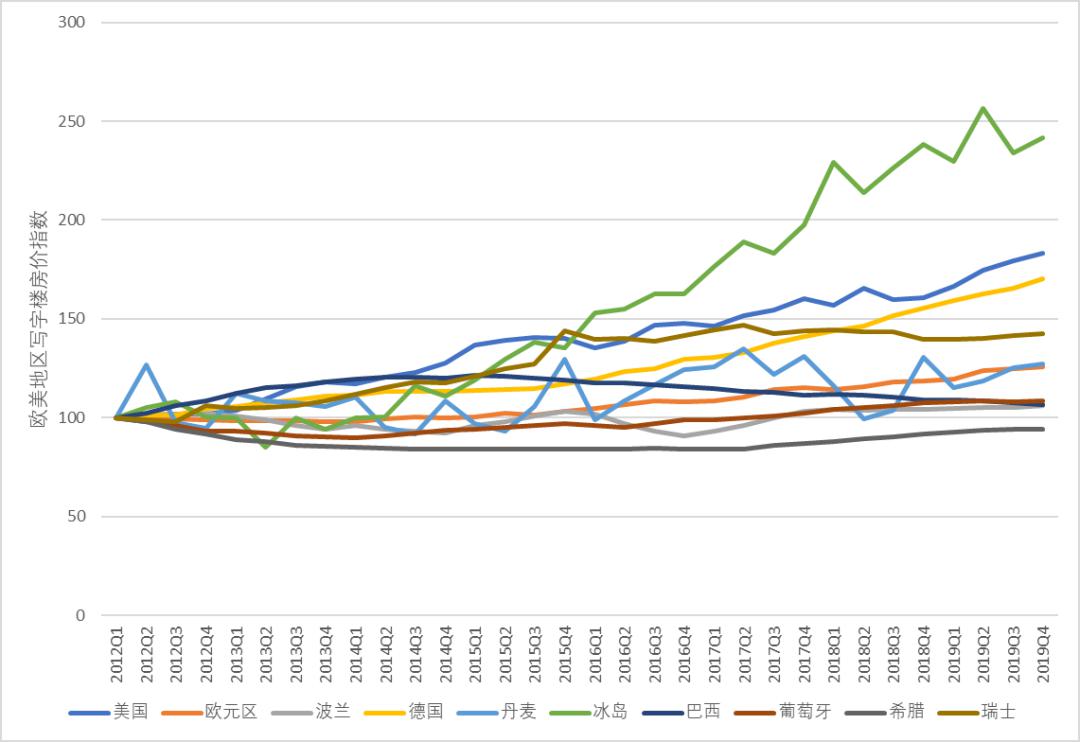 总体市场。从房价指数看(图5),欧美大部分经济体近十年写字楼租售市场运行平稳,冰岛、美国、德国写字楼价格涨幅较大,以巴西为代表的南美市场增长乏力。从租售市场整体表现看(表2),2019年欧美地区主要城市大多数交易额增加,空置率降低,收益率相对稳定。2020年2月以来,欧美地区经济受新冠疫情影响较大,多国不断紧急出台经济刺激措施。疫情造成当前不动产租售市场交易情况相对不乐观。但倘若各国疫情在第二季度得到控制,疫情对投资信心指数的影响得以消化,疫后一两年,欧美地区写字楼租售市场可能整体好于前10年平均水平。但应警惕英国“脱欧”过渡期内英欧自由贸易协议谈判、年末美国大选可能造成短期市场波动。市场发展趋势仍具有不确定性,发展前景谨慎乐观。