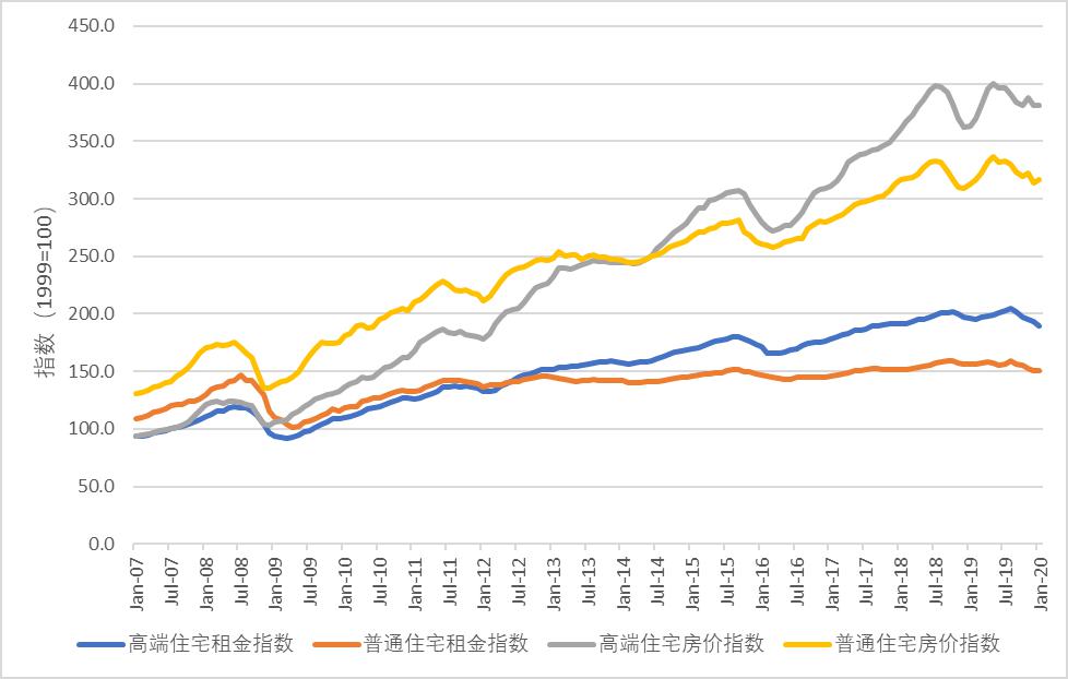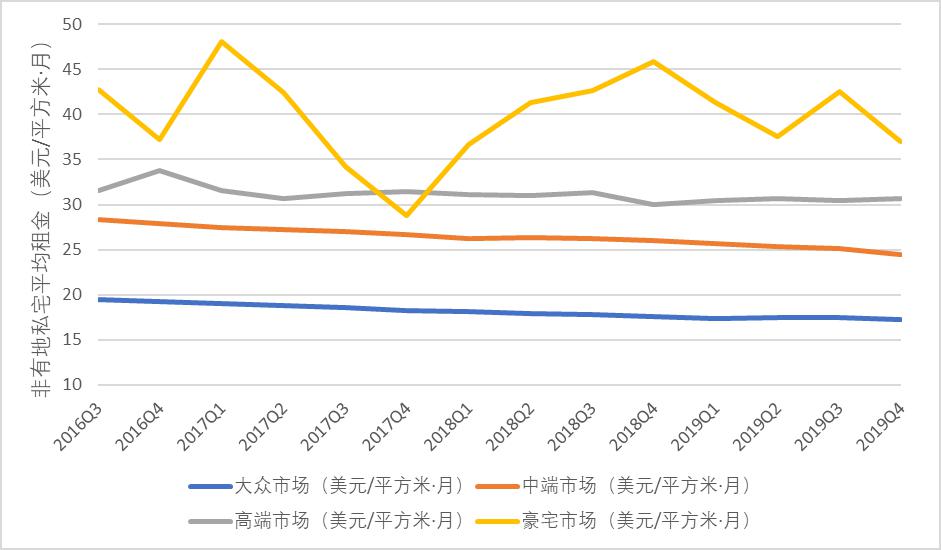 租赁市场:新加坡住房自有率极高,在2001年达到历史高点93.1%,此后一直维持在90%左右,只有收入极低的公民和短暂旅居的外国人租房居住,占比不到10%。租房人数相对较少,非有地私宅租赁市场较小,租金收益率长期稳定在2.5%—3.5%的水平。2019年,非有地私宅的大部分细分市场租金基本保持稳定,豪宅市场波动较大(图18)。