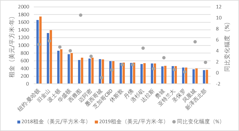 美洲地区。美国市场,大部分城市写字楼租售市场相对成熟,租金稳健增长。2019年,美国写字楼租赁投资净额约277亿美元,同比上涨19.5%。西雅图是最受青睐的投资城市(图6),租金增幅最大(10.5%)。2020年,由于能源需求下降、油价下跌和海外石油产量增加,休斯敦和丹佛等依赖能源的写字楼市场可能会产生动荡,其他集中在运输和贸易的市场也可能出现较大波动。但纽约曼哈顿、旧金山湾区、洛杉矶、波士顿、费城、芝加哥、达拉斯和华盛顿等市场基于其租赁活动的主要行业驱动因素,所受影响相对较小。