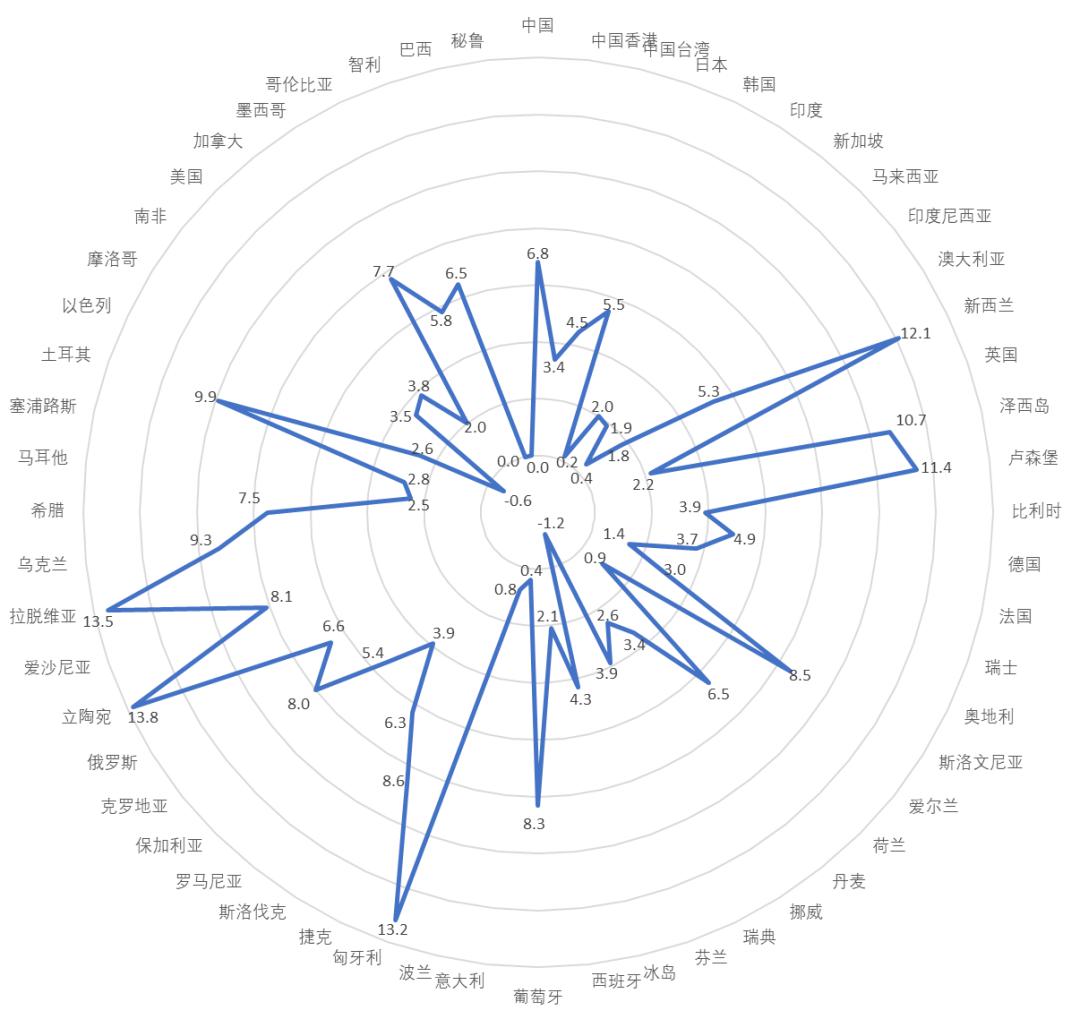 中房智库统计了2019年全球56个国家或地区的住房价格信息(图8)。其中,约96%的国家数据为上涨或持平。这可能是源于供需关系的不匹配:需求方面,在动荡时局下,低利率和有形资产的吸引力导致需求增加,进一步传导使价格上涨;而供应方面,不少发达经济体经济增速减缓,劳动力市场趋于饱和,工资上涨动力不足,住房新增供应相对短缺。