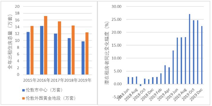 租赁市场。和销售市场类似,英国住房租赁市场供需严重失衡。仅从伦敦地区即可看出,2019年住房出租量连续第三年减少(图11),这源于市场可出租住房量的减少,导致部分需求难以得到纾解。而在2018年6月—2019年12月,伦敦租房需求基本呈边际递增趋势,供需矛盾在2019年第四季度达到巅峰(图12)。全国范围内,租赁市场供需关系及变化趋势基本一致。这导致2017年以来,全国平均租金在三年内增长19%。在Build-to-rent(建房出租)政策保障下,英国政府目前计划提供约13.2万套专用租赁住房,但与全国460万个有租房需求的家庭相比,仍是杯水车薪。未来五年,租房者需求将继续对英国住房租赁市场的租金价值施加上涨压力,预计人口众多、需求旺盛的伦敦租金涨幅最大。