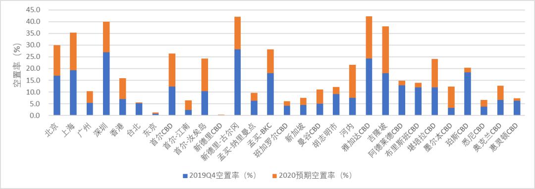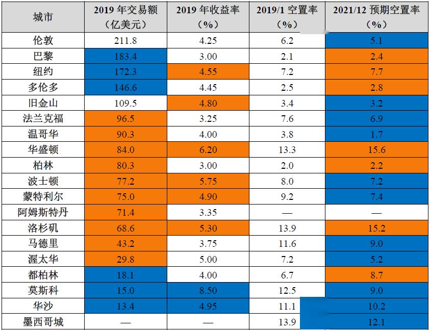 注:交易额(亿美元)、2019年收益率(%)的橙色、蓝色底纹分别表示2019年较2018年增长、减少,无底纹表示持平;2019/1空置率(%)为后列比较基准,无底纹;2021/12预期空置率(%)的橙色、蓝色底纹分别表示2021/12年较2019/1升高、降低;—表示无数据。