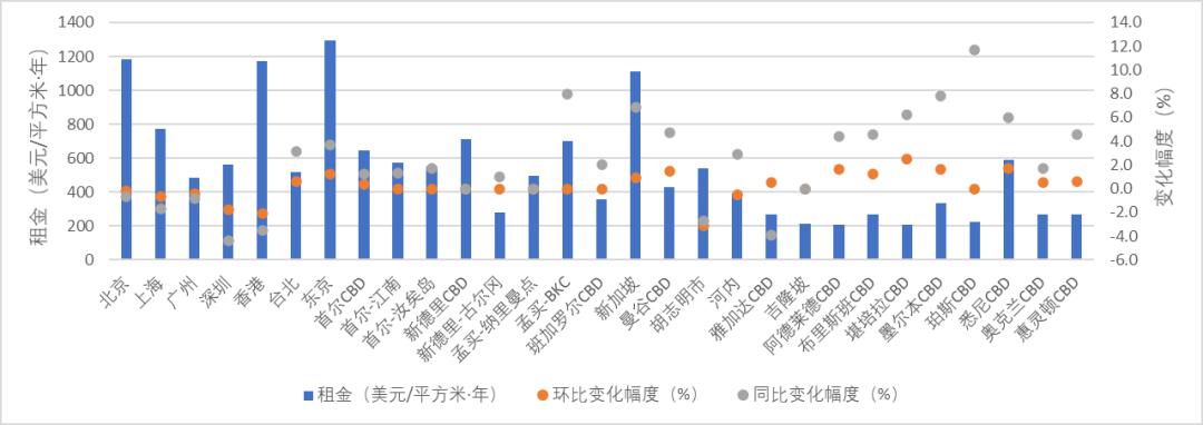 总体来看,近十年亚太地区写字楼租售市场缓慢上行。但由于近两年经济增速放缓,世界主要经济体之间贸易争端加剧了全球贸易不确定性与紧张局势,外加一些地缘政治因素,部分区域市场转冷,有的出现下跌。如图1,市场消化金融危机影响、结束两年快速下行期后,于2010年触底反弹,房价增速远远快于租金增速,租金增长幅度小,时至今日还未达到2008年初巅峰水平。2019年第四季度,写字楼价格环比上涨1.0%,同比上涨6.2%;租金环比下跌0.2%,同比上涨0.7%。2020年,受新冠疫情影响总体房价指数和租金指数有下行可能。