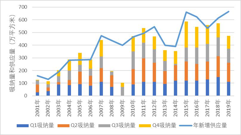 具体来看,亚太地区不同区域写字楼租售市场分化加剧。从总体供需看,2017年以来供应量的增加和需求相对疲软,共同导致总吸纳量从2018年的短期高点掉头向下,不同区域差异显著。如图2,亚太地区2019年全年净吸纳量为104.05万平方米,总吸纳量为473.81万平方米,同比下降18%,跌至5年来最低。中国内地和中国香港特区跌幅最大,写字楼全年交易额下降到330亿美元。北京和上海吸纳量同比下跌44%;香港特区写字楼吸纳量受修例风波影响在第四季度跌幅较大,成为2016年第二季度以来首次下跌。