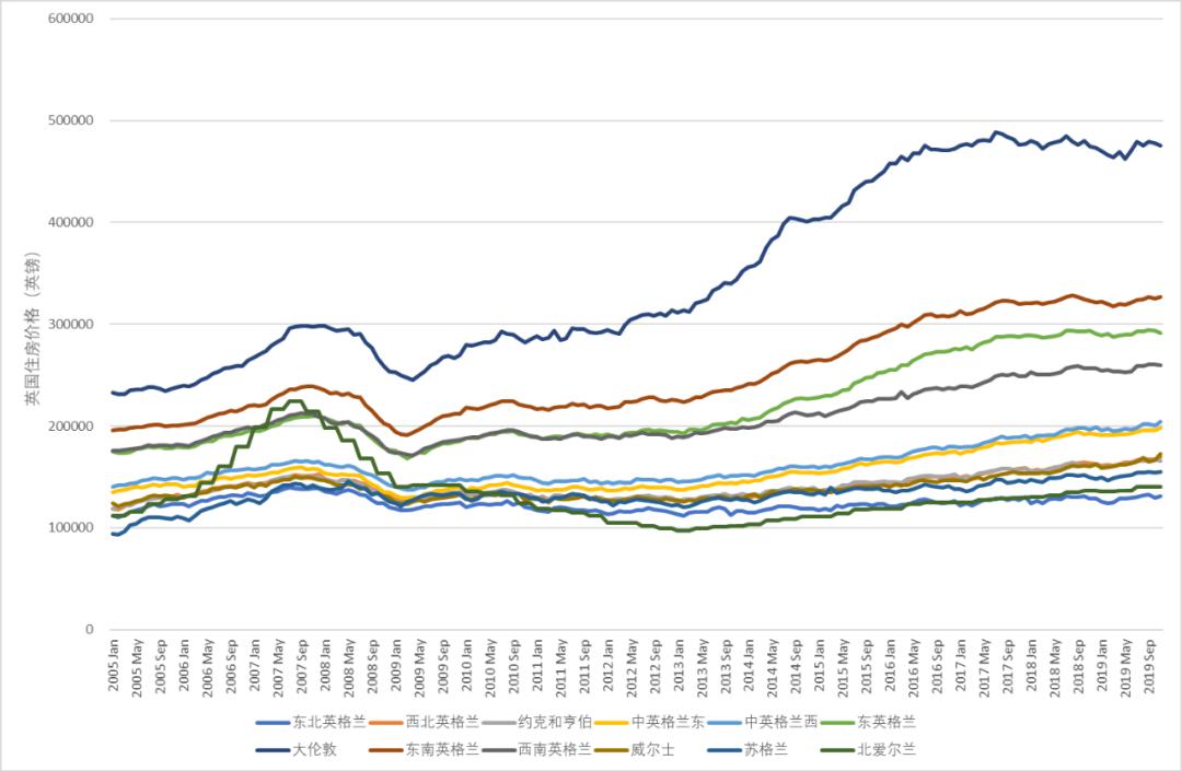 从住房价格看,2017—2018年,由于税收变化和政治不确定性,英国房价基本保持持平或下跌状态。根据英国国家统计局的统计(图10),2019年,全国平均房价上涨2.2%,伦敦房价上涨2.3%,创下自2017年9月以来伦敦房价的最高纪录。未来五年(即下一次大选前),在经济和就业增长前景更为乐观的预期下,大伦敦区域、英格兰东南部和东部的经济增长将相对强劲。