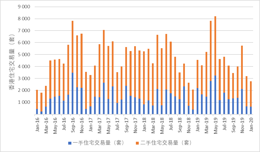 2019年,鉴于不明朗因素持续笼罩着香港的经济前景,内地和本土投资者倾向把资产转移至海外作分散投资,下半年市场持续低迷。英格兰银行在2019年12月发表的《金融稳定报告》中指出,受香港的社会动荡影响,自去年4月以来已有高达50亿美元的资金从香港的投资基金流出。2019年第三季度,非储备资产性质的金融资产整体净流出1635亿港元(相当于本地生产总值的22.6%),环比、同比分别上升329%及118%。香港地产、金融业受挫,写字楼租金指数首先出现下滑,进一步传导至住宅租售市场,趋势上表现为波动性量价齐跌状态(图14—15)。2020年1月,销售市场,一二手住宅销售量共计2762套,环比下降13.3%,跌至13个月最低;租赁市场,交易量减少,租金指数环比下跌2.2%,房东在租赁条件上更为灵活,愿意提供短期租赁以吸引租房者。