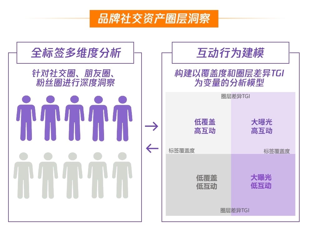 社交能关注品牌与消费者社交互动关系的价值,对品牌的社交资产进行衡量和诊断。为此,将品牌资产按曝光与互动强度分为社交圈、朋友圈、粉丝圈。