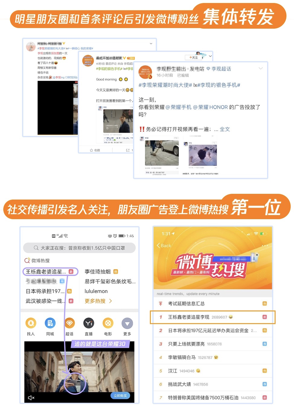 为此,荣耀30系列携手代言人李现给出了一个教科书式的示范。最近,“王栎鑫老婆追星”话题词在短时间喜提微博热搜榜首,而追的正是“现男友”的朋友圈广告,随之登上热搜的除了追星对象李现之外,荣耀30系列新品也占领了话题热议的高地。此次朋友圈广告的互动点击率创近年来行业新高,视频播放量更是达到2亿+,并发酵至微博获得粉丝、大号集体转发po图,成功进行了借势明星代言的破圈传播。