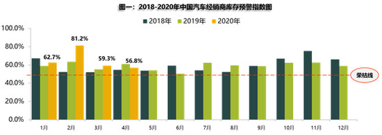 中国汽车流通协会5月度会发布数据显示,2020年4月汽车经销商库存预警指数为56.8%,位于荣枯线%,流通协会表示,虽然4月是传统消费淡季,客流量仍未达到去年同期水平,不过随着国内疫情发展趋势可控,加之经销商降价促销、政策刺激等因素,使得库存预警指数有所下降。