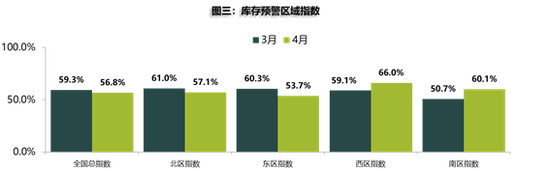 4月份全国库存总指数为56.8%,北区57.1%,东区53.7%,以上两个地区库存预警指数环比均有所下降。而西区和南区却环比分别上升至66.0%和60.1%,尤其是南区,环比涨幅接近10个百分点。对此,流通协会表示,由于4月有清明节,南方部分地区消费者受传统习俗影响不在4月购车,导致南区指数较高。