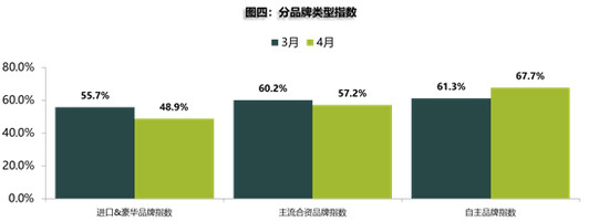 从分品牌类型指数看,4月进口&豪华品牌指数及主流合资品牌指数环比分别下降6.8%、3.0%;自主品牌指数则环比上升6.4%。原因是海外疫情导致多家整车厂及零部件厂关闭,车辆供给紧张,此情况在豪华品牌中尤为明显,其指数甚至已处于荣枯线以下。