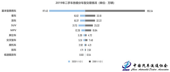 2020年一季度汽车消费品零售总额6326亿元,同比下降30%。其中整车情况处于平均水平以下,基本型乘用车共交易117.43万辆,同比下降39.95%;客车16.62万辆,同比下降49.79%;载货车16.37万辆,同比下降49.18%;SUV 21.73万辆,同比下降14.16%;MPV12.28万辆,同比下降38.11%;交叉型乘用车5.51万辆,同比下降26.42%。