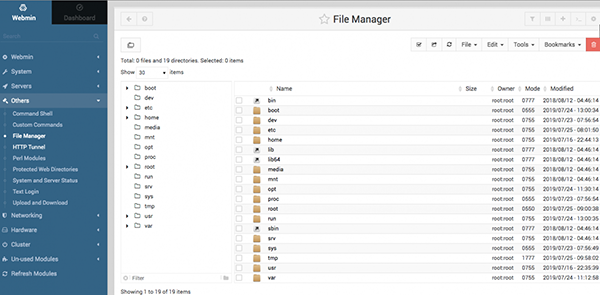 我没有显示Webmin每个选项的截图,而是让你自己去发现摸索,不过有一个值得仔细研究一下:Others。信不信由你,我在这组小应用程序上可花了不少时间。下面,我从列表中选择了“文件管理器”,以表明这些实用程序的深度和丰富程度。志愿者开发人员在创建对忙碌的系统管理员大有用处的工具方面做得很出色: