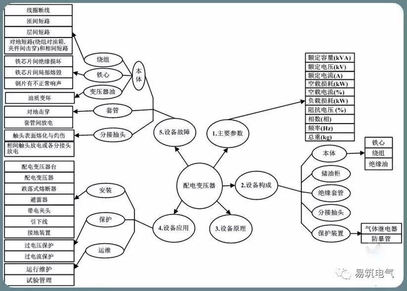 本次小编以油浸式配电变压器进行结构介绍,油浸式配电变压器按其结构可分为本体、储油柜、绝缘套管、分接开关、保护装置等。如下图