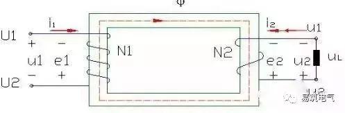 1=-N1dφ/dt、e2=-N2dφ/dt。式中N1、N2为原、副线圈的匝数。由图可知U1=-e1,U2=e2(原线表示,副线表示),其复有效值为U1=-E1=jN1ωΦ、U2=E2=-jN2ωΦ,令k=N1/N2,称变压器的变比。由上式可得U1/ U2=-N1/N2=-k,即变压器原、副线圈电压有效值之比,等于其匝数比而且原、副线圈电压的位相差为π。进而得出: