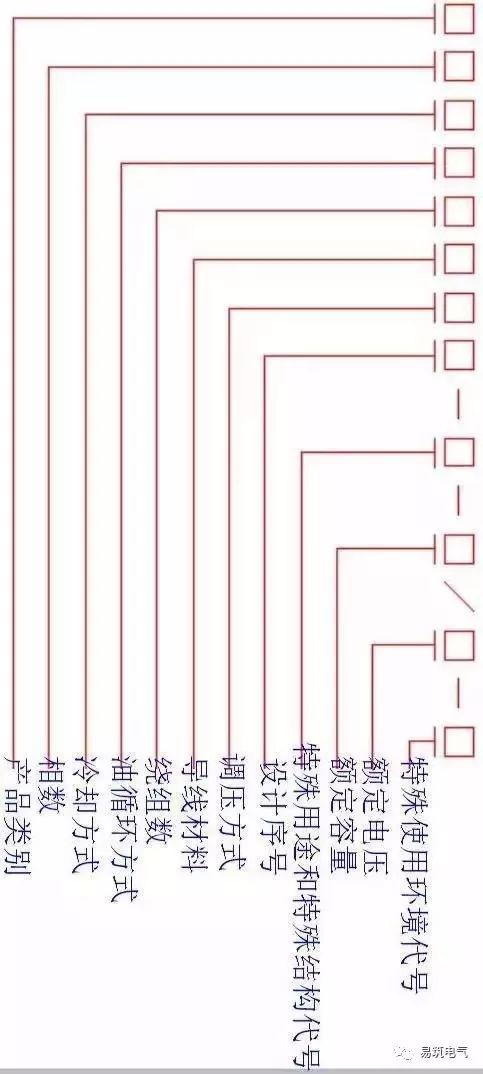 根据变压器一、二次绕组的相位关系,把变压器绕组连接成各种不同的组合,称为绕组的联结组。为了区别不同的联结组,常采用时钟表示法,即把高压侧线电压的相量作为时钟的长针,固定在12上,低压侧线电压的相量作为时钟的短针,看短针指在哪一个数字上,就作为该联结组的标号.如Dyn11表示一次绕组是(三角形)联结,二次绕组是带有中心点的(星形)联结,组号为(11)点。5. 产品型号