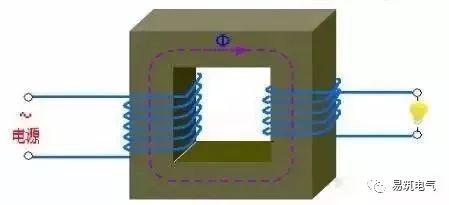 铁心的作用是加强两个线圈间的磁耦合。为了减少铁内涡流和磁滞损耗,铁心由涂漆的硅钢片叠压而成;两个线圈之间没有电的联系,线圈由绝缘铜线(或铝线)绕成。一个线圈接交流电源称为初级线圈(或原线圈),另一个线圈接用电器称为次级线圈(或副线圈)。实际的变压器是很复杂的,不可避免地存在铜损(线圈电阻发热)、铁损(铁心发热)和漏磁(经空气闭合的磁感应线)等,为了简化讨论这里只介绍理想变压器。理想变压器成立的条件是:忽略漏磁通,忽略原、副线圈的电阻,忽略铁心的损耗,忽略空载电流(副线圈开路原线圈线圈中的电流)。例如电力变压器在满载运行时(副线圈输出额定功率)即接近理想变压器情况。