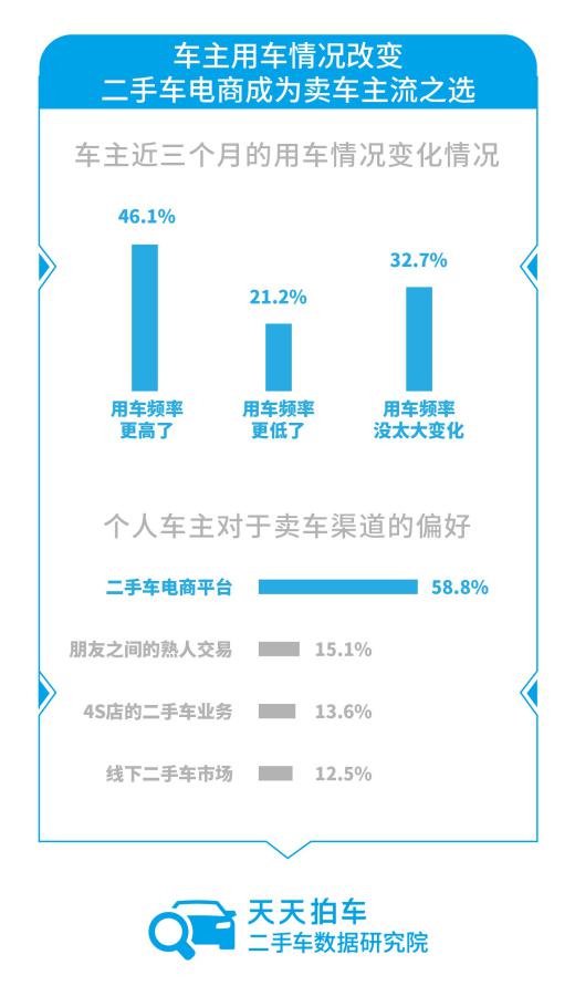 受疫情影响,大部分家庭的用车情况或多或少都有所变化。调研数据显示,与疫情发生前相比,近三个月,有46.1%个人车主的用车频率更高了,21.2%的个人车主用车频率有所降低。究其原因,部分车主以往出门会在一定程度上采用公共交通,而在疫情期间,出处安全因素考虑,更多地倾向于自驾出行,使得用车频率明显提升;而另一部分车主,更多地选择宅在家中,用车频率也就因此降低。