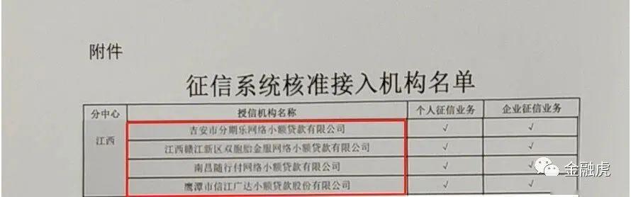 金融虎讯 4月29日消息,据江西省小额贷款行业协会(下称“协会”)官微消息,吉安市分期乐网络小额贷款有限公司(下称“分期乐网络小贷”)、南昌随行付网络小额贷款有限公司(下称“随行付网络小贷”)、江西赣江新区双胞胎网络金服网络小额贷款有限公司及鹰潭市信江广达小额贷款有限公司(下称“广达小贷”)等4家协会会员单位,近日获批接入央行征信系统。