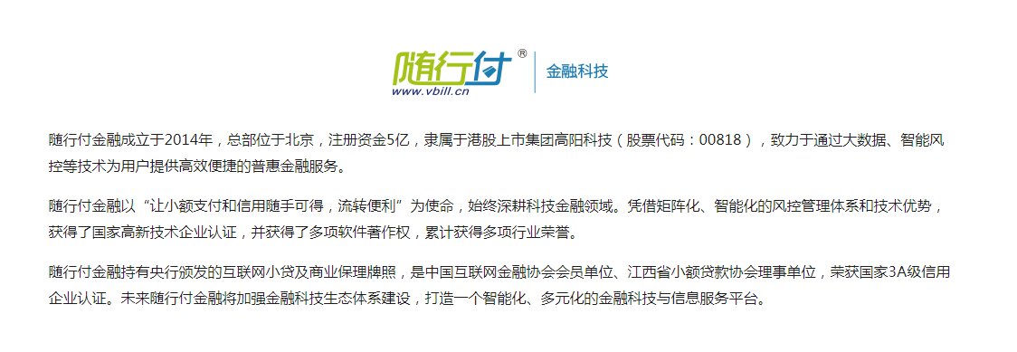 企查查显示,随行付网络小贷工商登记网址为总部位于北京的“随行付金融”;而“随行付金融”官方公号账户登记主体,也显示为随行付网络小贷。官网信息,“随行付金融”成立于2014年,隶属于港股上市公司高阳科技(中国)有限公司(下称“高阳科技”)。“随行付金融”持有央行颁发的互联网小贷及商业保理牌照。