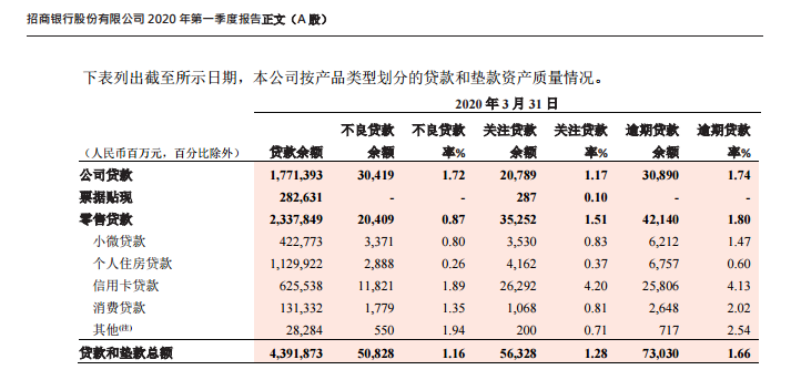 作为银行零售市场中的明星选手,招行的信用卡业务被疫情猛烈冲击。招行2020年第一季报显示,信用卡新生成不良贷款66.29亿元,同比增加26.91亿元;零售贷款(不含信用卡)不良生成额14.29亿,同比增加2.21亿元。