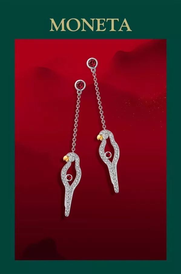 高级珠宝世家 MonETA 巧妙的将品牌图腾鹦鹉幻化成时髦造型,以当代线条形状演绎美丽与生命信使-鹦鹉的俏皮状态,宝石与美钻交织出动人的光影。