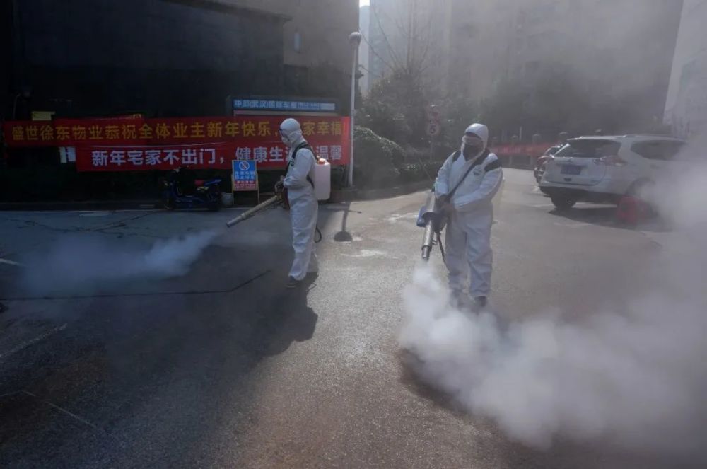 3月5日,在湖北武汉,工作人员在一个居民小区进行消毒。新华社记者
