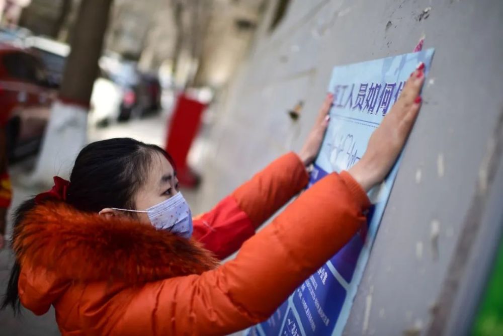 3月3日,在青海西宁,一名志愿者在社区张贴防疫宣传画。新华社记者吴刚摄