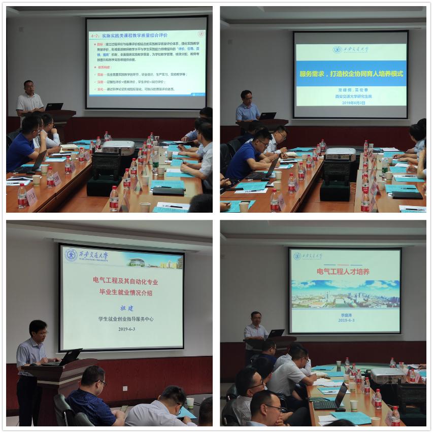 会上,实践教学中心徐亮副主任、研究生院龙建纲副院长、就业创业指导服务中心祖建副主任分别从学校实践教学体系构建、工程研究生培养模式、电气工程专业毕业生就业情况三个方向进行了汇报。李盛涛常务副院长详细介绍了电气学院人才培养目标及模式。