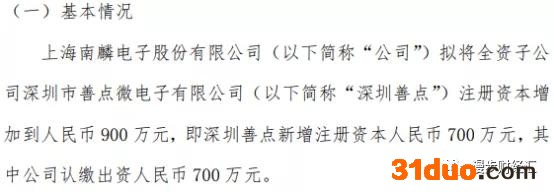 南麟电子(831394)发布公告,公司拟将全资子公司深圳市善点微电子有限公司(以下简称“深圳善点”)注册资本增加到人民币900万元,即深圳善点新增注册资本人民币700万元,其中公司认缴出资人民币700万元。
