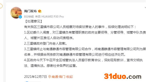 12月7日中午,海门区官微“海门发布”通报事件处理意见:第一,区纪委介入调查,对三星镇负有管理职责的政府主要领导、分管领导、城管中队负责人、城管片区责任人启动问责程序。第二,三星镇政府登门向老人致歉。第三,三星镇终止与南通静通市容管理有限公司合作,将该公司列为黑名单,并根据合同条款进行相应的经济处罚。